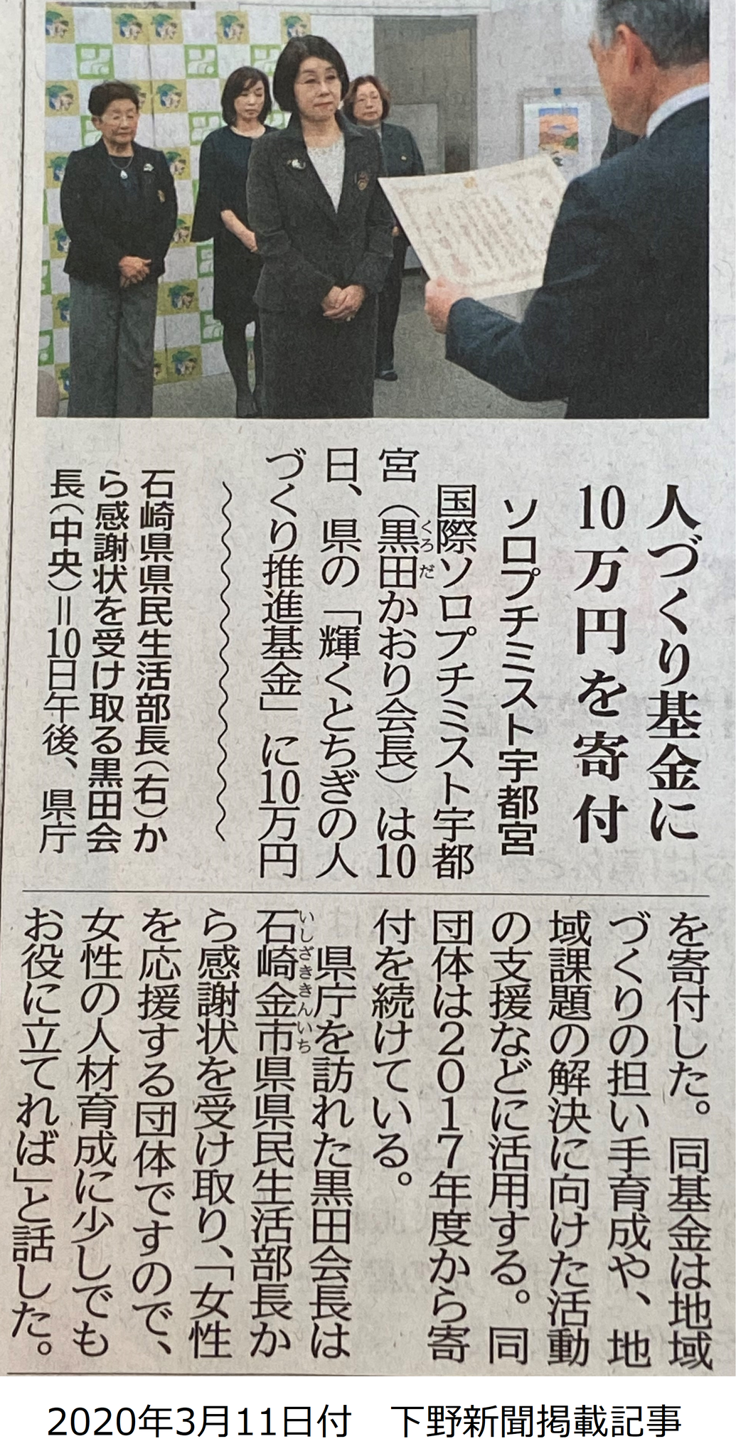 3月10日、栃木県庁舎本館7階・県民生活部長室おいて「輝くとちぎの人づくり推進基金」への寄付に対する感謝状の贈呈式が執り行われました。 石崎金市県県民生活部長から黒田かおり会長に栃木県知事感謝状が授与されました。 石崎県県民生活部長から当クラブの寄付に対する感謝の挨拶を頂きました。...