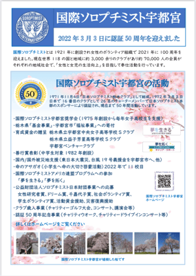 広報 · 2022/03/06 国際女性デーソロプチミスト・キャンペーン 2022年3月3日~8日 於:護国会館 コロナ禍で大々的にキャンペーンはできませんが、国際女性デーの意味と、SI宇都宮認証50周年記念事業について、今までに活動を展示アピールしています。産経新聞・下野新聞に掲載して頂きました。 tagPlaceholderカテゴリ: