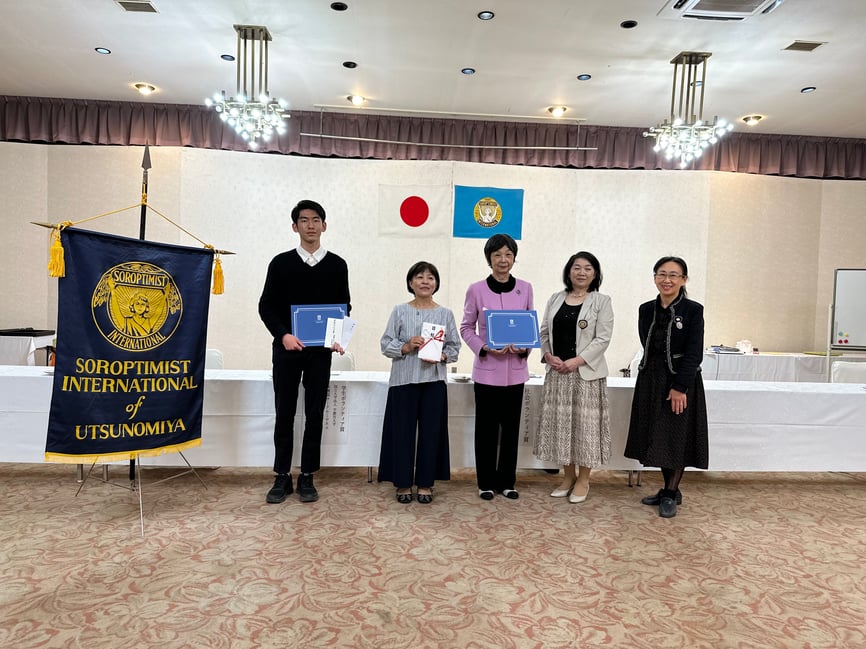 続いて、ソロプチミスト日本財団に応募いただきました、女性研究者賞日本医科大学 病態解析学部門講師 高野 晴子様(欠席のためメッセージ代読)、社会ボランティア賞 NPO法人CCV理事長 福田 由美様・学生ボランティア賞 宇都宮大学ボランティアサークルミヤネコ 会長 江場 永遠様に贈呈がされました。その後、各受賞者から活動の報告がなされました。