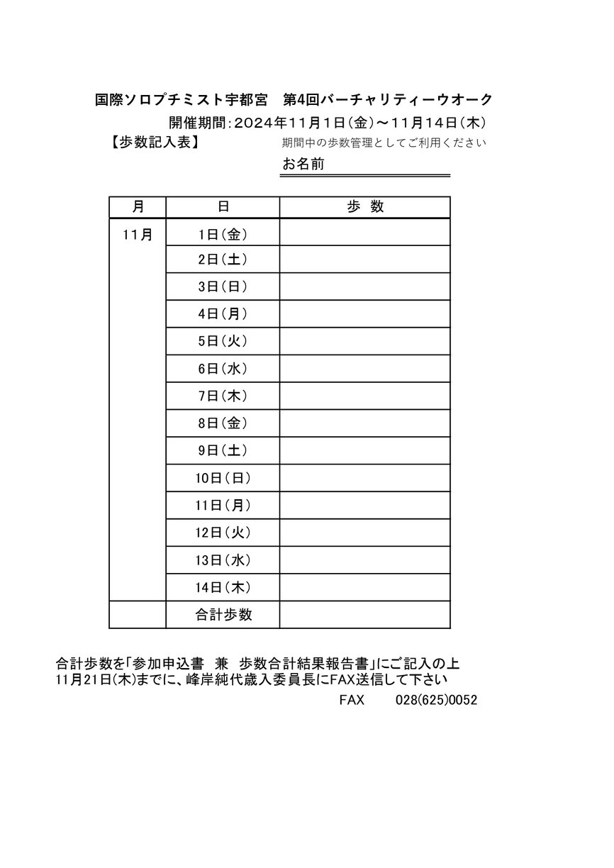 歳入 · 2024/09/24 第4回バーチャリティーウォーク申込書・歩数管理表 🍂バーチャリティーウオークに参加ご希望の方は下記申込書をダウンロード記入しFAXしてください。 🍂申込書の下に歩数記入表がございます。結果報告をFAXしてください。 バーチャリティーウオーク参加申込書2024年度.pdf PDFファイル 402.3 KB ダウンロード バーチャリティーウオーク参加申込書2024年度.xls Microsoft Excel 36.5 KB ダウンロード 2024年度 バーチャリティーウオーク歩数管理表.pdf PDFファイル 154.4 KB ダウンロード 2024年度 バーチャリティーウオーク歩数管理表.xls Microsoft Excel 38.5 KB ダウンロード tagPlaceholderカテゴリ: