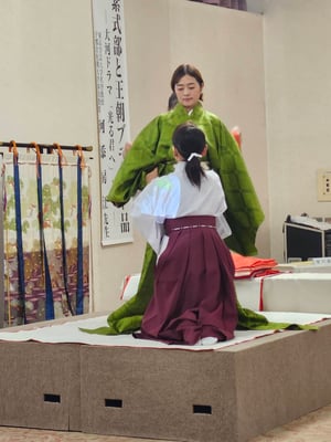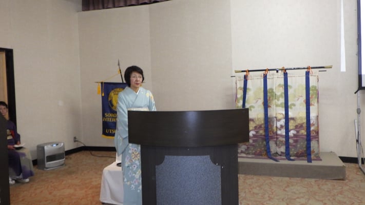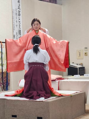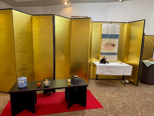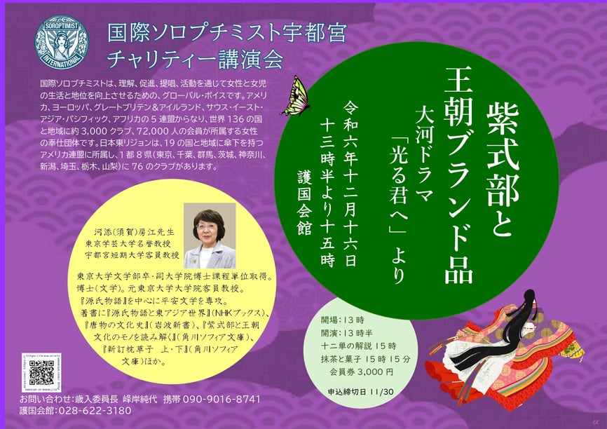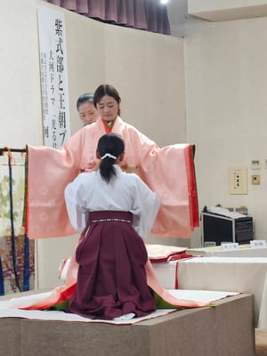 東京学芸大学名誉教授・宇都宮短期大学名誉教授の河添(須賀)房江先生より、総集編を間近に控えて源氏物語の雅な世界をご講演いただきました。内容は、当時の装束や唐物、調度品、お香や菓子に至るまで。また、和紙やお香などの展示、衣紋道高倉流東京道場門弟の御二人による十二単着付け「お服上げ」実演も解説いただき、源氏物語に因んだ呈茶やお棚と、とても華やいだ会となりました。